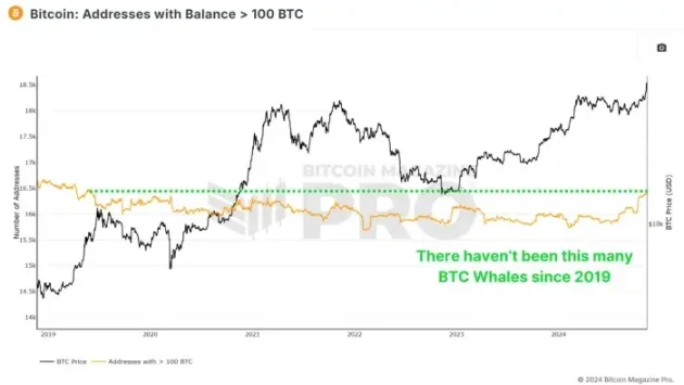 有趣的是,虽然散户地址数量没有大幅增加,但持有 100 BTC 以上的「鲸鱼」地址数量却在不断增加。在过去几周里,持有大额 BTC 的钱包增加了数万枚比特币,价值达数十亿美元。这表明,即使比特币达到历史最高水平,鲸鱼投资者仍然对当前价格水平上涨充满信心。