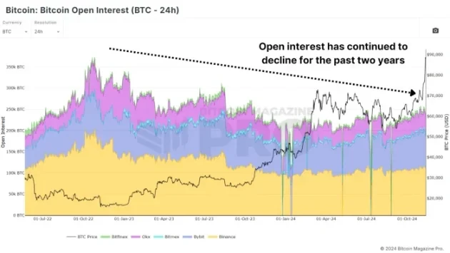 比特币最新一轮上涨的一个关键是现货驱动,这与之前依赖杠杆头寸推动的牛市形成鲜明对比。比特币衍生品的未平仓合约仅出现小幅增长,与之前的峰值形成鲜明对比。例如,在 2022 年 FTX 崩盘之前,未平仓合约就相当可观。现货驱动的市场没有过度杠杆,往往更加稳定和有弹性,因为面临强制清算风险的投资者更少。