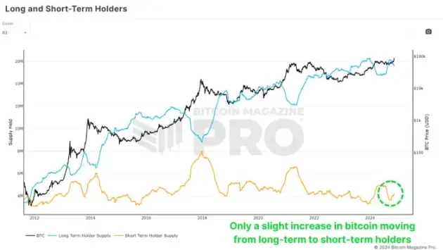 从历史上看,在 2020-2021 年的上一轮牛市中,我们看到大量资金从长期持有者流向新投资者,从而推动了随后的价格上涨。目前,这种转移并不明显,尽管价格上涨,长期持有者选择继续持有比特币。这种惜售的态度表明,持有者对进一步上涨的潜力充满信心。