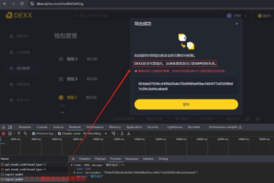 尽管再三声明无Rug,但身经百战的社区显然有所怀疑。后续慢雾、比特丛林的初步调查,更是加重了平台Rug的嫌疑。调查显示,DEXX平台有重大安全问题,不仅作为非托管平台在官方服务器中储存用户私钥,而在用户导出私钥时,更是未采取任何加密措施,导致私钥在传输过程中以明文形式暴露。