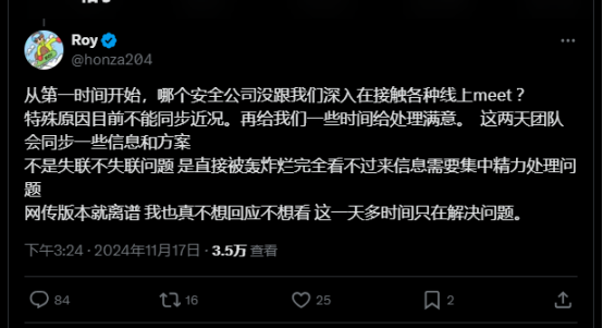 在事件发生当天,DEXX迅速作出回应,声明无Rug,问题正在全力排查。而其创始人Roy(@honza204)也紧随其后回应“会掏钱补,隔离了部分用户,没 RUG, 在 排查,无法一一回复,放心。”