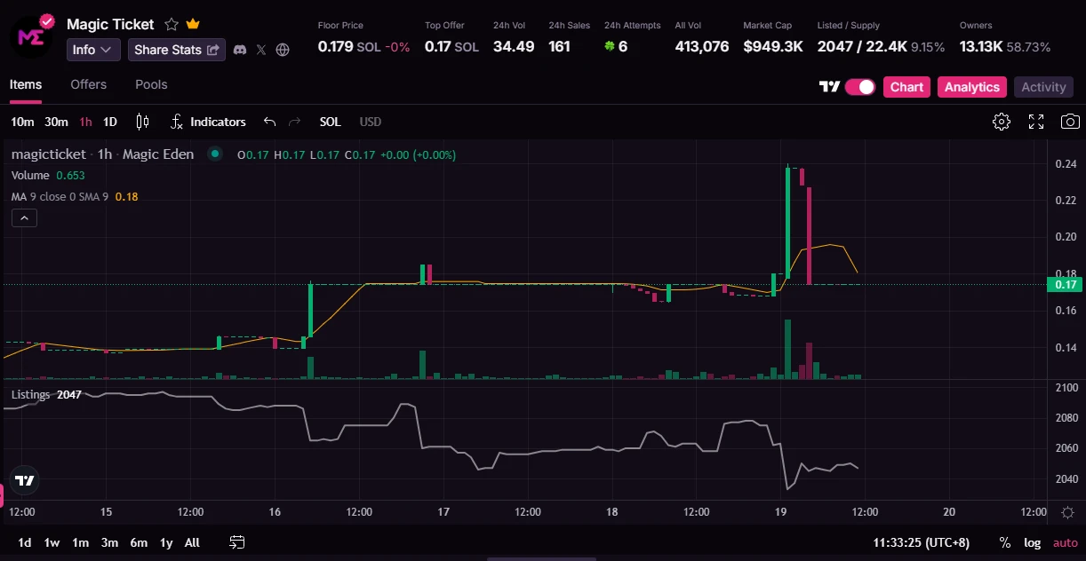 然而,Magic Tickets 的地板价今早短暂拉升至 0.24 SOL 后迅速回落,目前已回落至发布 ME 代币经济学消息前的水平,暂报 0.179 SOL。