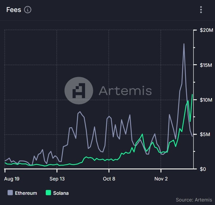 根据 Artemis 数据 ,过去三个月来,原本以太坊(Ethereum)的链上手续费都是高于 Solana 的,但是在 11 月中后,Solana 的每日手续费收入达到约 1,000 万美元,已超过同时间的以太坊收入,这是否会成为市场一个新转捩点,值得我们持续关注。