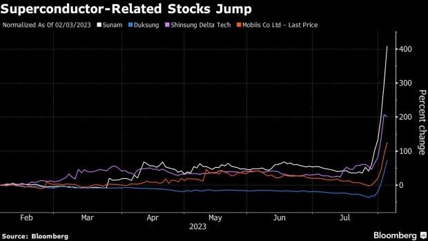 在超导体技术突破的消息发布后,股市中一些与超导相关的韩国股票吸引了大量投资者。Duksung Co. 和 Sunam Co. 等韩国超导概念小盘股连续第三个交易日涨停 30% 。Sunam Co. 在过去六个交易日暴涨约 260% ,Duksung 上涨了 170% 。Mobiis Co. 周四上涨 30% ,而 Shinsung Delta Tech Co. 短暂上涨 21% ,创下历史新高。
