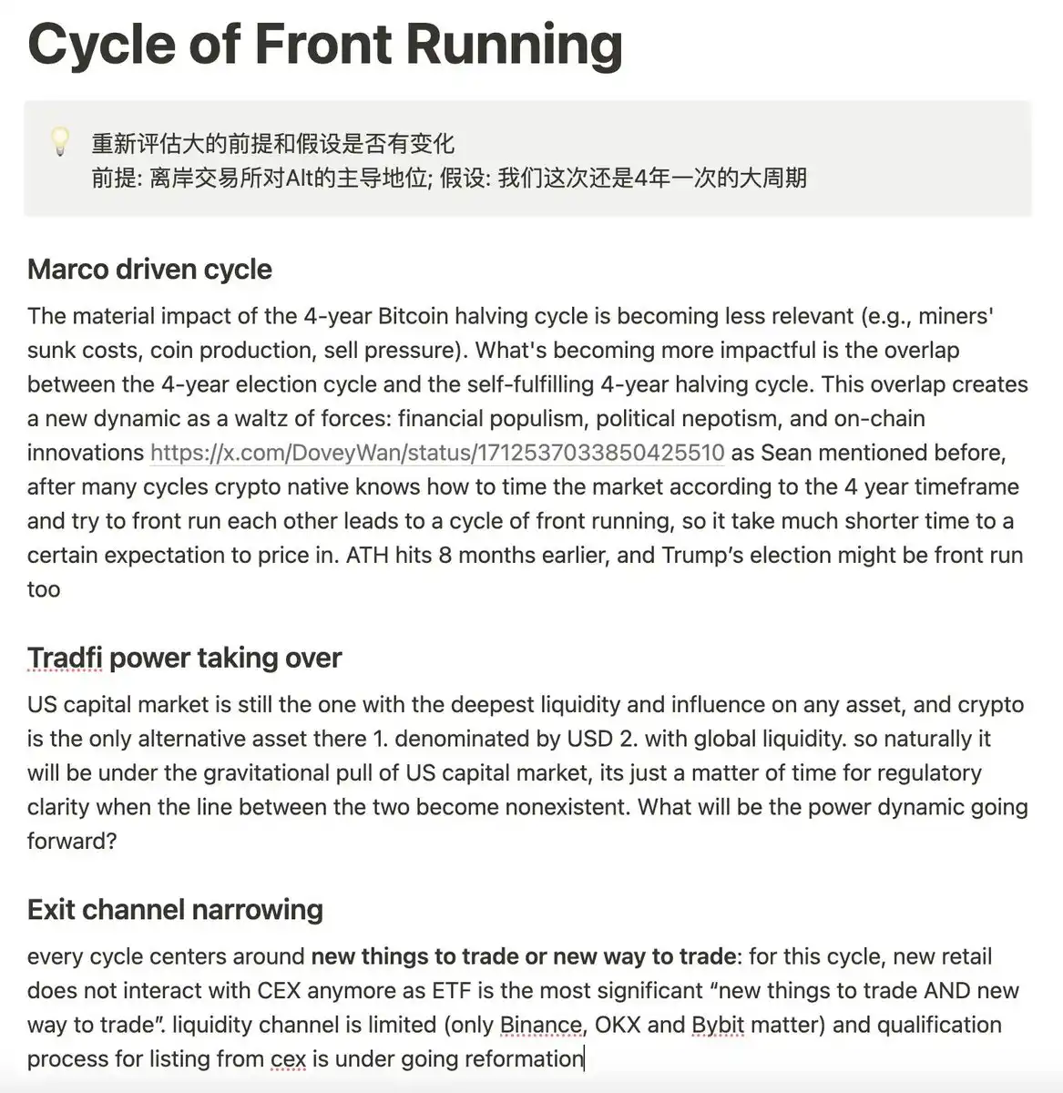 今年年初我们对行业结构变化进行了大量复盘,写下了这一篇内部报告「Cycle of Front Running」,TLDR: 我们行业的两极化越来越严重了。 一方面,行业体量变大,TradFi 通过 ETF 等合规手段将大量 Crypto 资产融入了华尔街,这一部分的流动性被抢走,且很难再转化为我们场内资金;另一方面,民粹资本主义的强烈扩张,注意力经济进一步压缩,整个金融化过程愈发简单粗暴,最 Crypto Native 的方式变成了直接炒 Meme,这也是 TradFi 无法触及的领域。