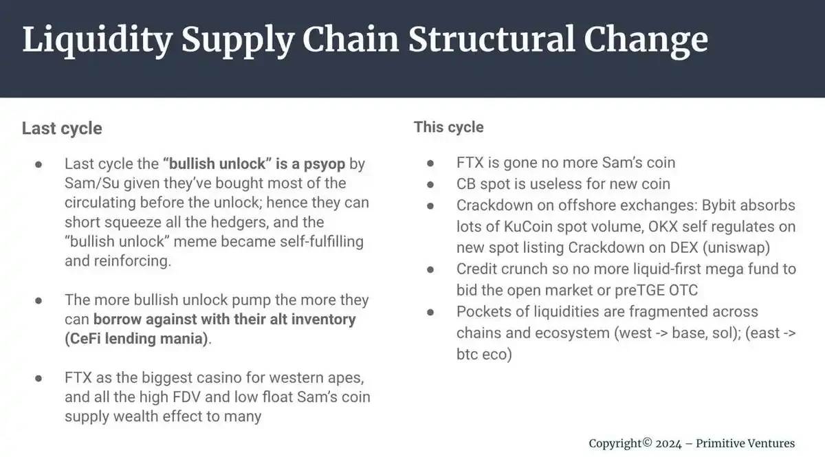 而现在呢?VC Token 碰到的问题就是这两个 Community 的割裂,主网刚上就 TGE,产品根本没有落地,Community 都是来撸空投的,带来的都是卖盘;而上个 Cycle 我们还有 Sam/Su 帮我们上杠杆买入 Alt,但这个 Cycle 杠杆基本被出清;同时,在上个牛市很多 VC 募到了大量资金,有布局的压力,而为了给 LP 看到漂亮的账面回报,不得不一轮轮推高项目的估值。