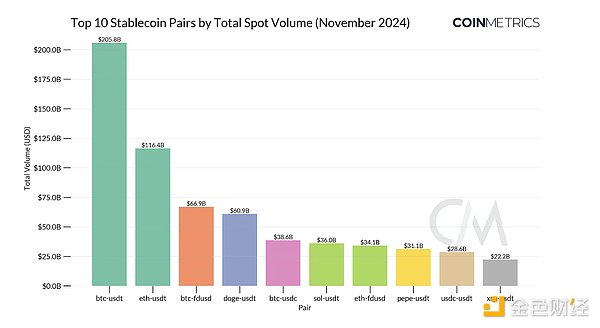 - 除了作为价值存储手段之外,稳定币在牛市中还是至关重要的交易媒介。大选后,各大交易所的稳定币交易量飙升至 1200 亿美元,交易量最大的交易对包括 BTC、ETH、SOL 和 memecoins。