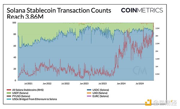 - 随着 11 月份调整后的稳定币转账量(美元)突破 500 亿美元,链上活动呈上升趋势。在 USDC 使用量的推动下,Solana 稳定币的交易量创下历史新高。