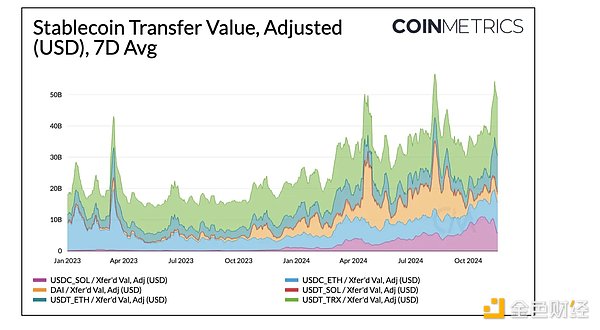 11 月份,不同稳定币地址之间原生单位转移的每周调整后转账额超过 500 亿美元。其中,182 亿美元(38%)来自 Tron 上的 USDT,123 亿美元(23%)来自以太坊上的 USDT,均创下了交易量的新高。以太坊和 Solana 上的 USDC 也表现出更大的吸引力,转账额呈增长趋势。