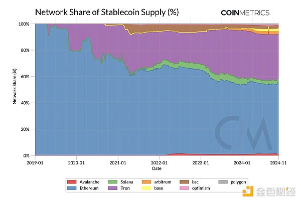 Tether 的 USDT 总供应量为 1250 亿美元,继续保持稳定币发行量的最大份额,市场份额为 66%。Circle 的 USDC 紧随其后,总供应量为 360 亿美元,市场份额为 19%。就网络而言,以太坊是发行稳定币最多的区块链,占稳定币总供应量的 1040 亿美元(55%)。Tron 继续保持稳定币供应量网络份额的 33%,主要由 USDT 推动。Solana 和以太坊第 2 层网络(Arbitrum、Base、Optimism)合计占稳定币总供应量的约 7.5%,反映了它们不断增长但仍在兴起的稳定币生态系统。