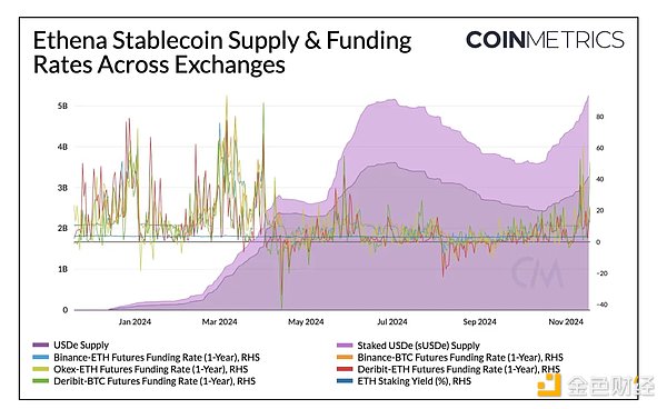 值得注意的是,各个交易所的 USDe 供应量与 ETH 融资利率之间存在密切关系。在融资利率为正的环境中,USDe 和质押 USDe(sUSDe)的供应量有所增长,而在融资利率转为负时,供应量则有所下降或停滞。有趣的是,Ethena 最近宣布计划推出 USTb,这是一种由贝莱德的代币化美国国债基金 BUIDL 抵押的新稳定币。这种稳定币旨在作为 USDe 的支持资产,帮助在导致融资利率疲软的市场波动期间管理风险。作为自第三季度以来增长最快的稳定币,Ethena 完全有能力利用不断上升的融资利率。