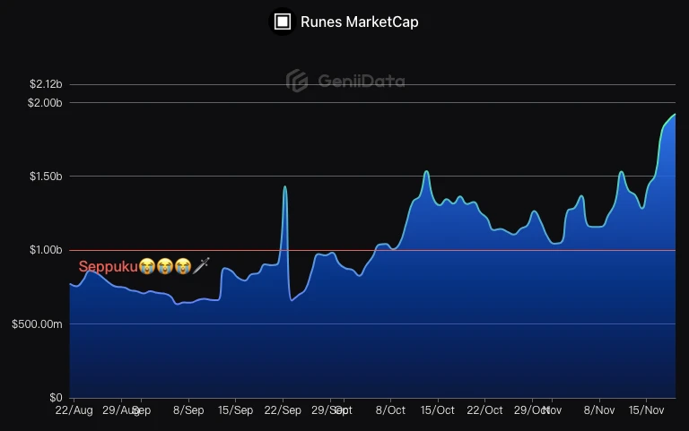 虽然从市值上看,当前符文总市值为 19.1 亿美元,仍不及 BRC-20 超 30 亿美元的总市值。但随著比特币生态逐渐回暖,符文总市值也在攀升,想像超越 BRC-20 只是时间问题。