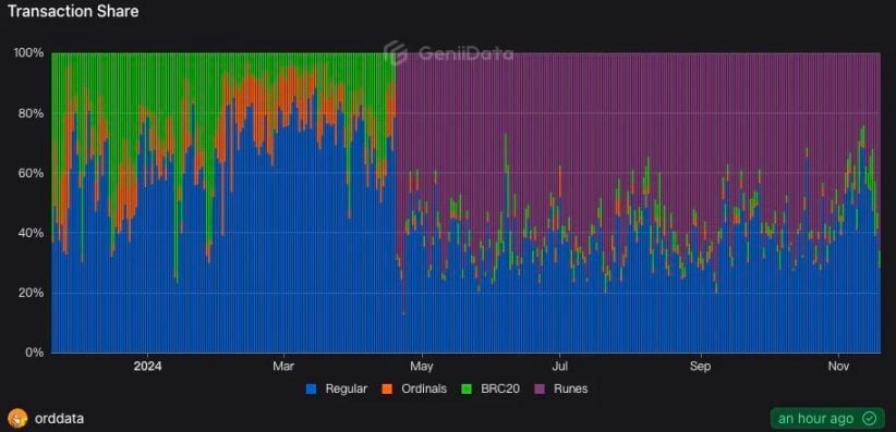 但这种情况𫔭始发生改变,符文正在成为比特币生态中资产发行协议的最大共识,甚至已经超越了「老大哥」BRC-20。从资料上来看,自今年 4 月符文协议正式释出以来,符文交易在比特币链上长期占据超 50% 的份额,其次是常规的比特币转帐交易或其他资产协议的交易(有些资产协议交易并未识别),而 BRC-20 和 Ordinals 的交易份额已经缩减至不足 10%。