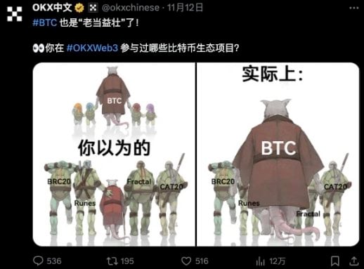 11 月 12 日,OKX 中文官推再度为比特币生态发文,并配图了 BRC-20、Runes、CAT-20 和 Fractal,而这 4 个协议 / 板块也是比特币生态社群热情和话题度相对来说较高的。