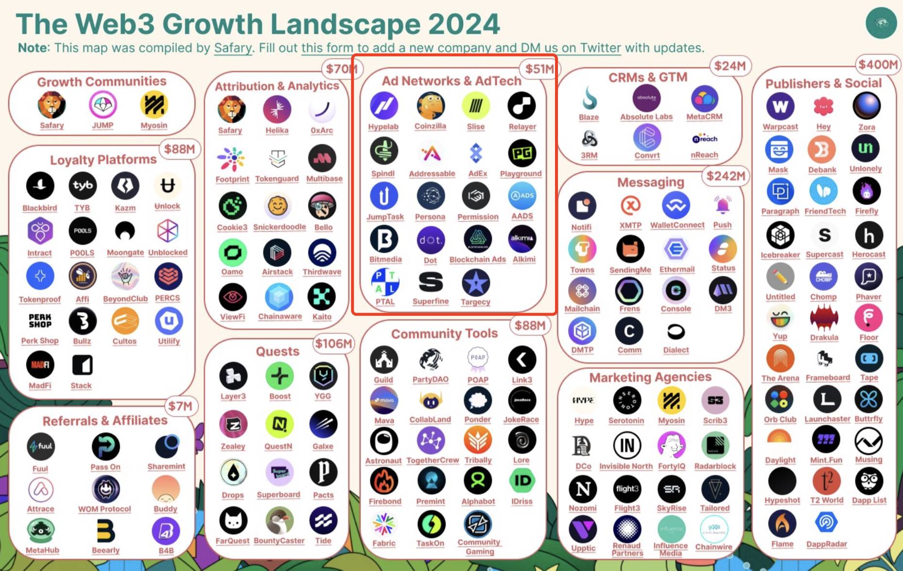 其实在 Web3 已经有一些类似的传统投放领域的项目,比如下图中的 Spindl,Addressable,就是一个根据 Web3 用户的链上行为习惯而打造的归因平台;Coinzilla,整合众多加密应用广告位的流量主网络。