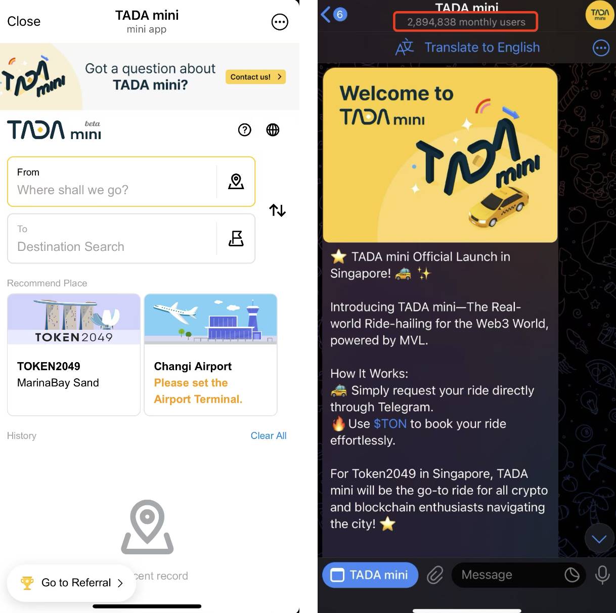 比如,就像前不久的 TOKEN 2049 ,TON 与 TADA 推出的 mini app,让用户开始可以直接通过 Telegram 进行打车,目前该应用显示其月活用户超 280 万。