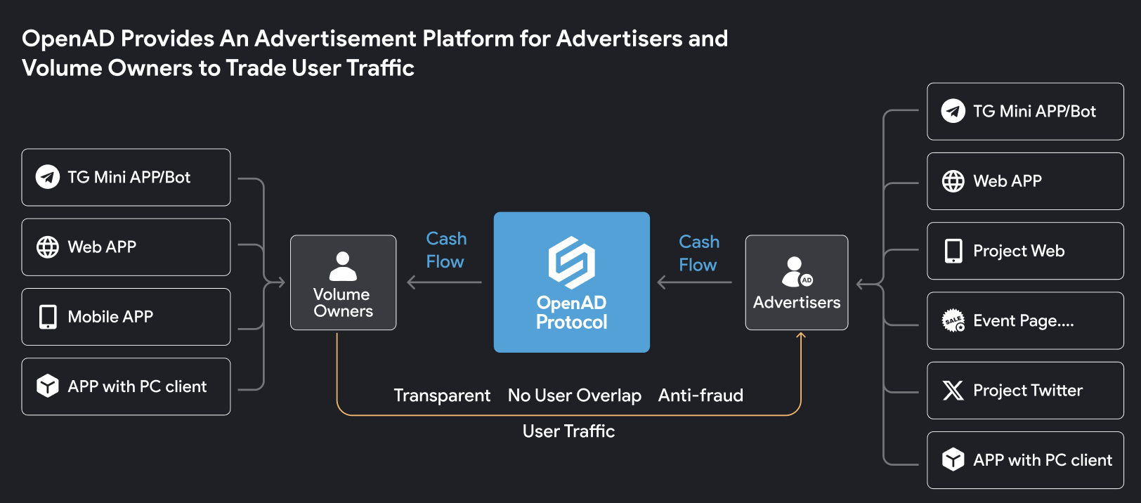 OpenAD 通过与多个行业内流量主(如多个大流量项目方)建立合作关系,形成一个高效的流量网络。同时,流量主也可以将自己的流量资源整合到 OpenAD 网络中,形成换量联盟,把原来只能自己 1 v1 BD 换量的关系,变成 1 vN 的关系,实现更好的效果。