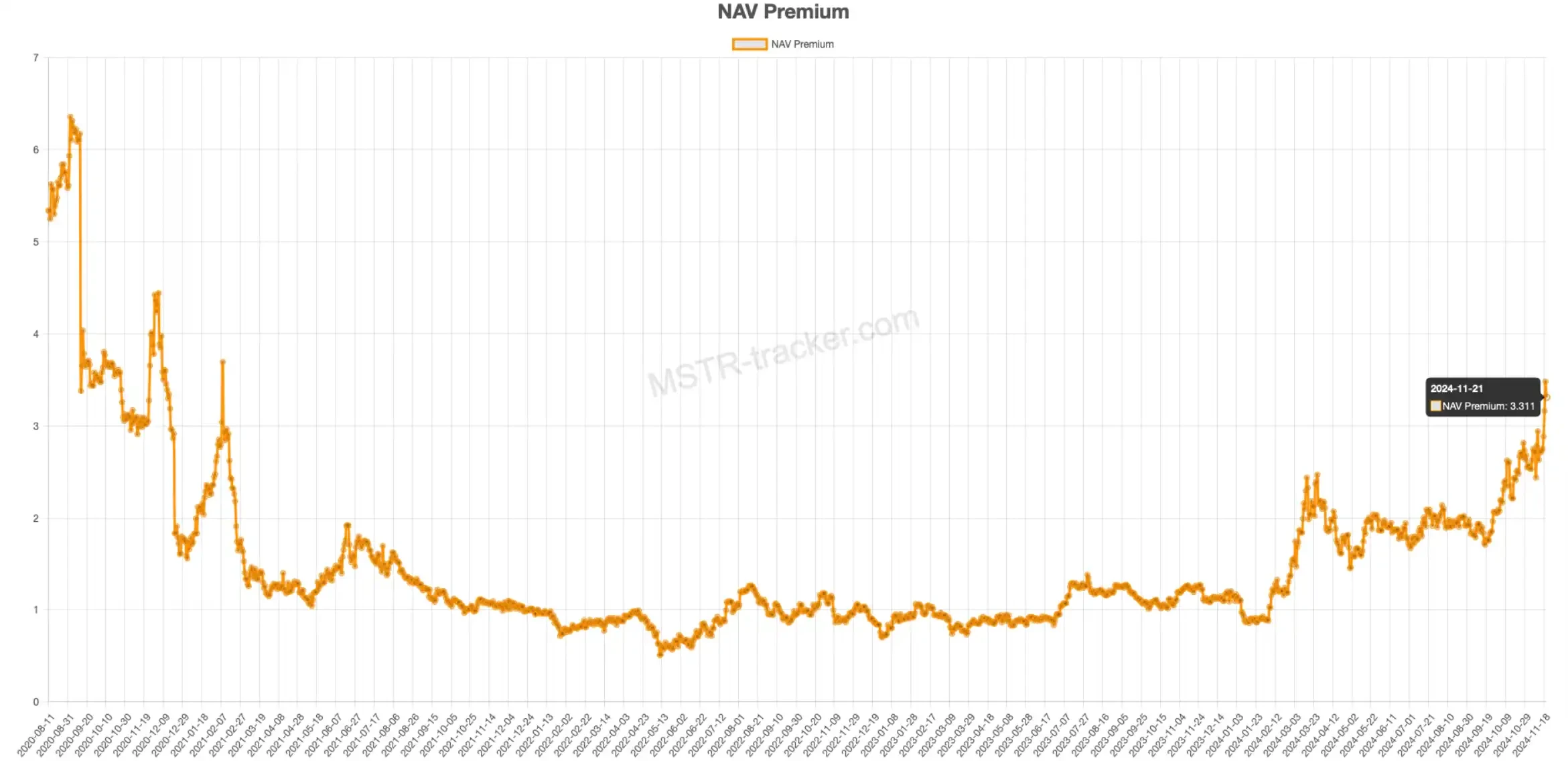BlockBeats 注,NAV 溢价系数(Net Asset Value Premium)和微策略的股票增发活动的相关度较高,MSTR 一旦增发后不久,该溢价系数就会往上走。根据 MSTR Tracker ,目前 NAV 溢价已经来到 3.3 左右。