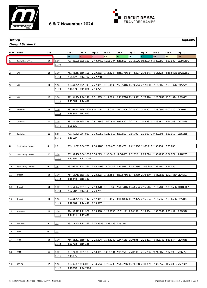 当地时间 11 月 6 日,在比利时著名的 Circuit de Spa-Francorchamps 赛道举行的 MotoPark 测试第一组第三赛程中,Gecky Racing 战胜 FRECA 等经典强队,荣获第一名!