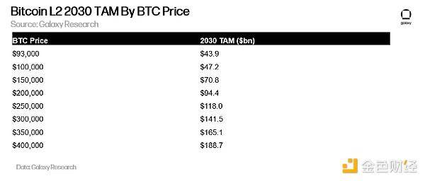 如果比特币在 2030 年达到 10 万美元,那么比特币 L2 的 TAM 可能会达到 470 亿美元,假设到 2030 年,比特币总供应量的 2.3% 被锁定在比特币 L2 中。
