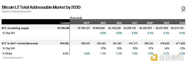 请注意,此分析可以粗略估计有多少 BTC 供应可以流入比特币 L2 以获得收益;它没有考虑比特币 L2 生态系统的潜在增长,其中包括将在这些 L2 之上发行的其他加密资产,例如符文、Ordinals、稳定币等。我们的 TAM 估计依赖于两个关键假设。首先,我们假设从现在到 2030 年,锁定在比特币 L2 中的 BTC 供应量百分比每年可能增长 0.25%;其次,我们假设 BTC 价格到 2030 年可能达到 10 万美元。我们的观点是,这些是对比特币 L2 用户的保守估计未来六年的需求和比特币价格。