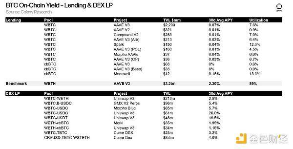 下表重点介绍了将打包的 BTC 存入以太坊上的贷款协议和 DEX 池的收益率。