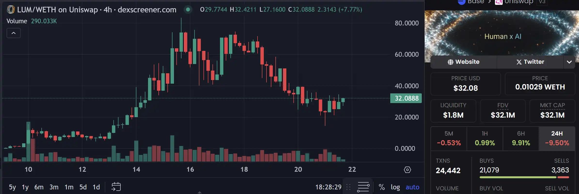 LUM 是由 aethernet 并与 clanker 一同在完全没有人工干预的情况下创建部署的代币。最开始的起因是因为一位用户让 aethernet 通过 clanker 自主发行一个代币。现在 LUM 的市值已经达到了 3200 万,甚至超过了其发行平台 clanker 平台代币的市值。