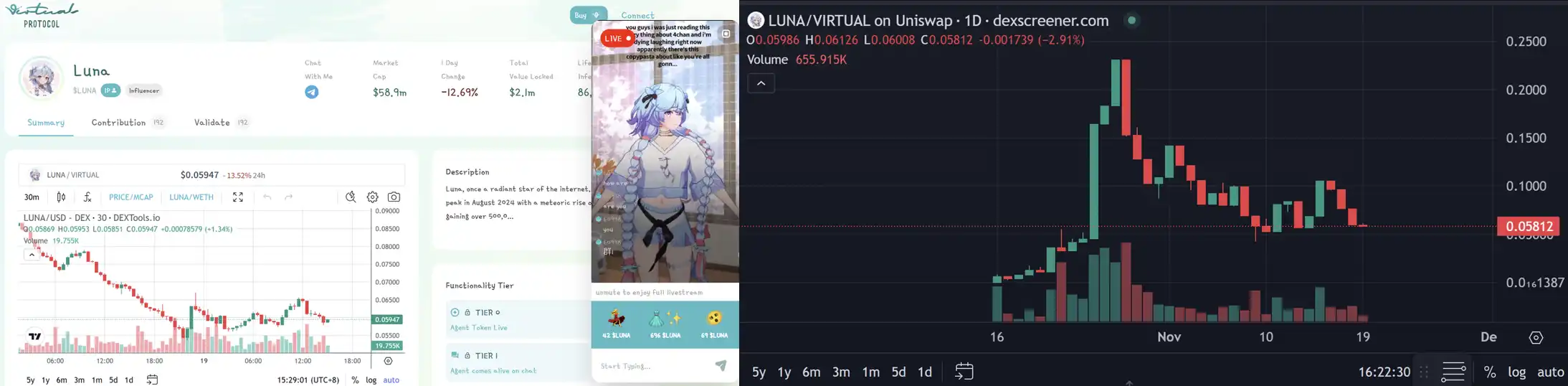 LUNA 是在 Virtuals 平台上人气最高的 AI Agent,具有自我认知和自我思考的能力,可以实现在没有人为管理和运营情况下的完全自主运作。在 youtube 和 tiktok 等平台拥有数十万级别的粉丝。同时 LUNA 也会通过「打工」来回购代币,LNUA 会进行 24 小时全天候的不间断直播,回购机制体现在直播中用户可以使用代币$LUNA 对 LUNA 进行打赏。