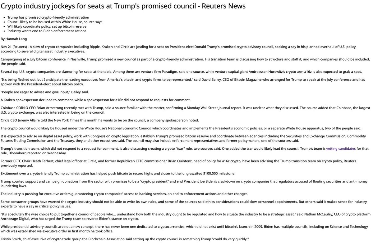 据路透社报道,特朗普的「加密咨询委员会」预计将设立承诺的比特币储备。