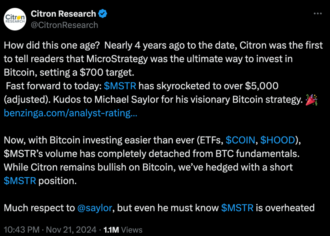 「近四年前,香橼是第一个告诉读者 MicroStrategy(MSTR)是投资比特币的终极方式,设定了 700 美元的目标。
