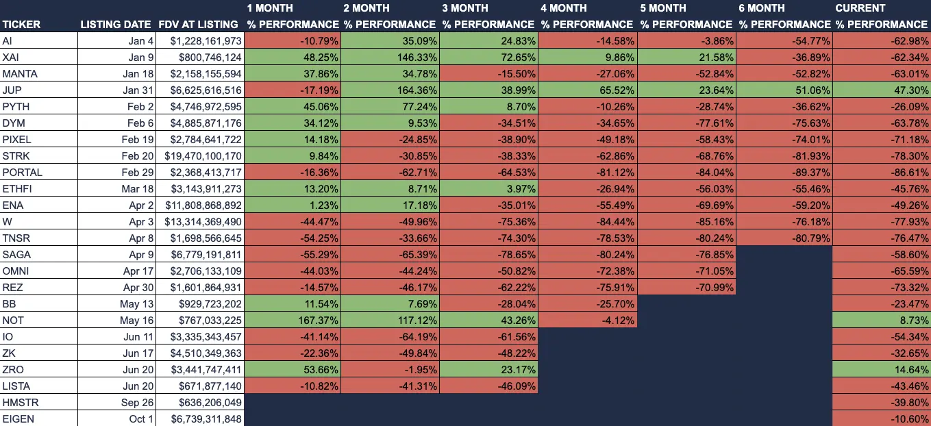 下方列出了一些风投支持的代币及其自 TGE 以来的表现。大多数代币在三个月后难以维持高估值,使得风投难以在归属期开始时以最高 FDV 实现投资。这样的价格走势对市场参与者不利,因为在归属期结束时,以高价买入的投资者和风投一起成为抛售者。