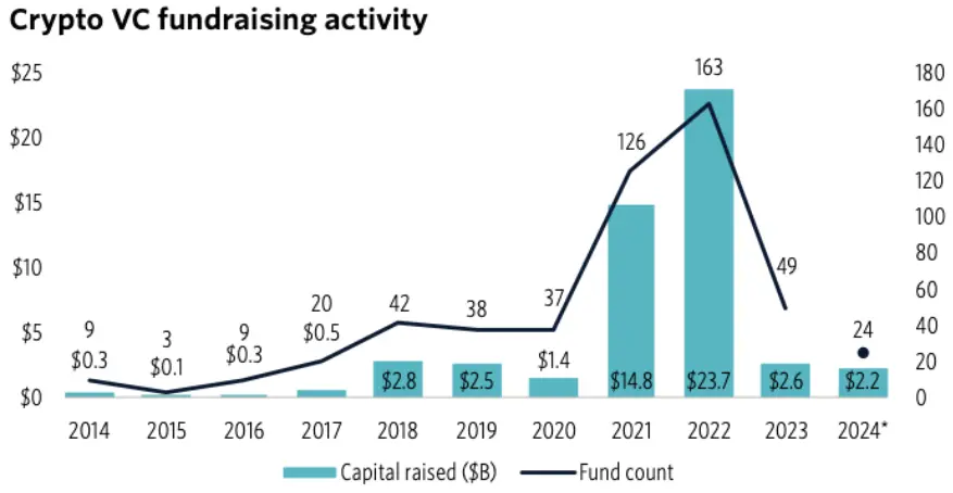 2021 年和 2022 年,在疫情刺激政策和此前募资的高回报承诺的推动下,募资水平达到了历史新高。在这段时间,由于风险投资基金充裕且急于投资,交易进展迅速。然而, 2022/2023 年的熊市带来了显著变化。下轮融资变得更加常见,投资者的风险偏好降低,TGE 的延迟成为常态。市场动态的变化以及 Terra、FTX 和 3AC 等高调崩溃事件导致基金表现停滞,资本流入加密风投的减少。
