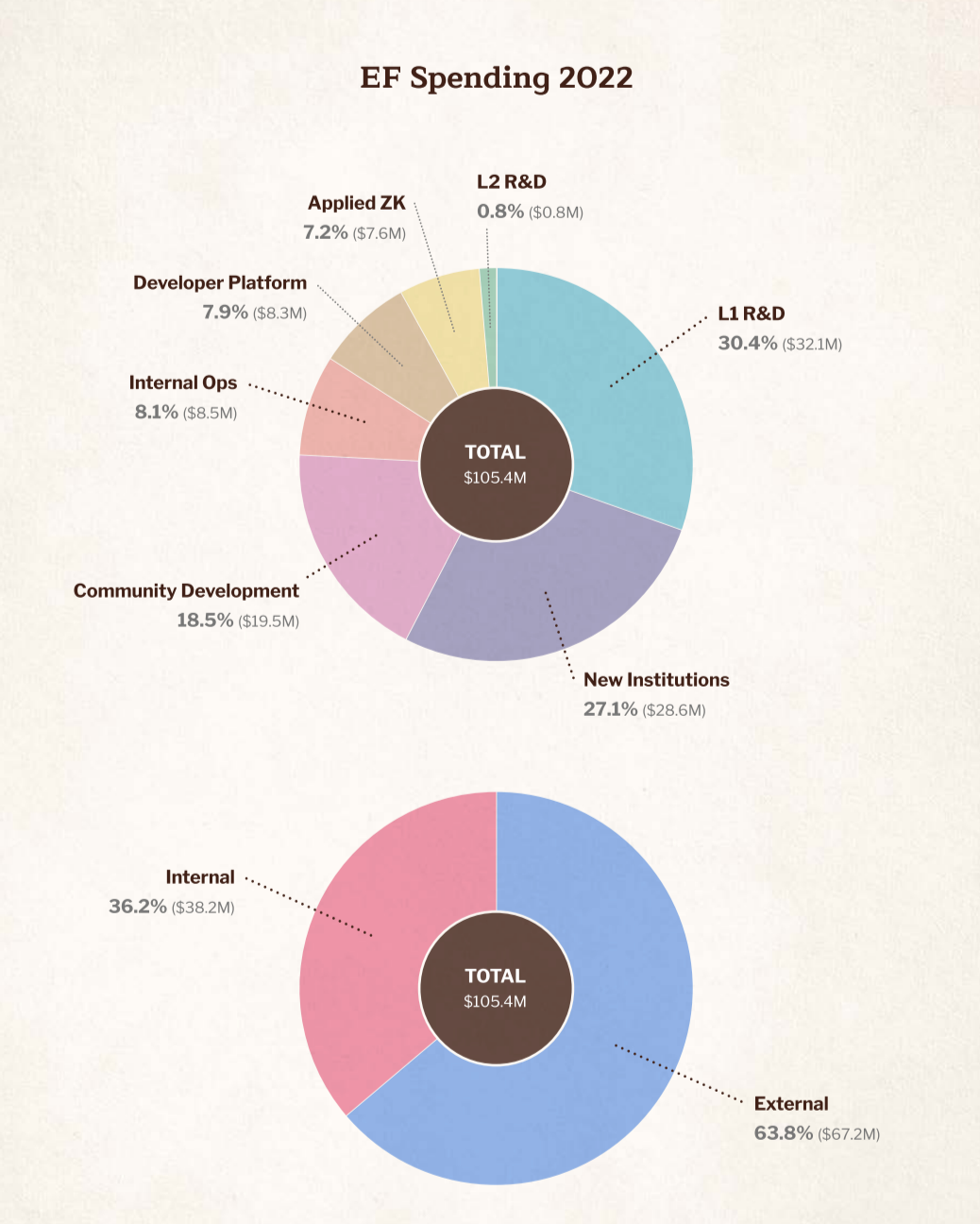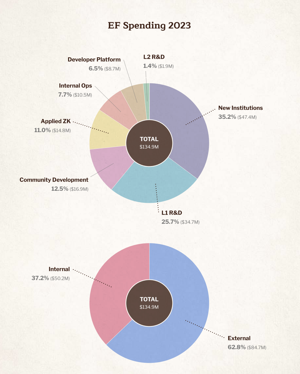 以太坊基金会的 2024 年度报告对过去两年的财务情况进行了详细披露,清晰展示了 2022 与 2023 年间的资金使用和管理状况。数据表明,基金会的支出主要集中在核心开发、生态资助和运营储备三大板块,涵盖了核心协议的安全升级、生态支持和风险管理等方面。
