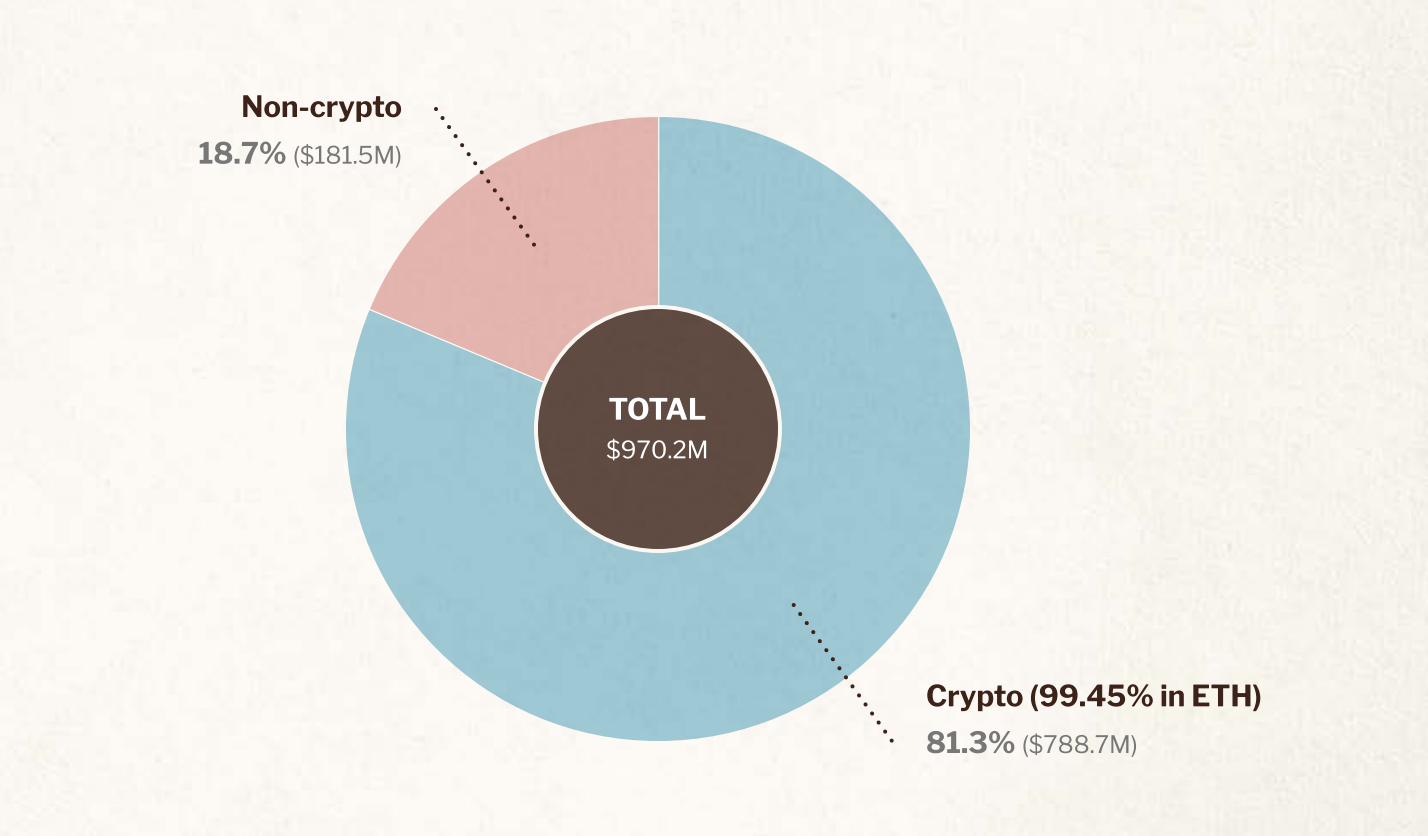 以太坊基金会的 2024 年度报告披露了其当前的国库资金持有情况。数据显示,以太坊基金会目前共持有$ 788.7 M 的加密资产,其中 99.45% 为 ETH,即 ETH 总价值约为$ 784.4 M。结合当前 ETH 市场数据来看,以太坊基金会持有的 ETH 总量大约在 261, 000 枚左右,约占以太坊总供应量的 0.22% 。