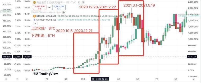 第三波 2021.3.1-2021.5.19阶段:BTC高位震荡,ETH开启大幅主升浪,直到519来临,一起下跌洗盘;