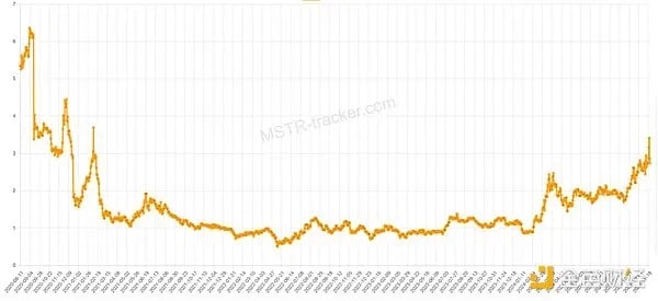 MicroStrategy 就更进一步,MicroStrategy 的市价股票发行是单向的,也不会陷入死亡螺旋,而且几乎是 0 成本的。MicroStrategy 显然比 Luna 更安全。即便在 2022 年的熊市期间,MicroStrategy 的净资产溢价最低也有 60%。
