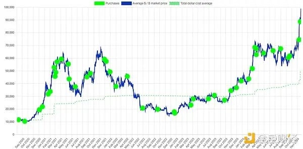 MicroStrategy 自 2020 年 9 月实施比特币储备𢧐略,4 年来穿越周期无惧牛熊地坚定执行比特币储备𢧐略,比如在 2021 年那轮牛市的 4 月和 11 月以超过 5.9 万美元𧹒入比特币。