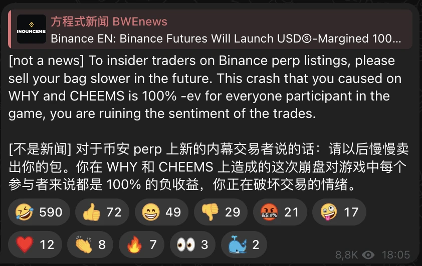 在上币公告发布的 30 分钟后,方程式新闻 在官方频道发文称 :“致参与币安永续合约上币的内幕交易者,请下次慢点抛售你们的筹码。这次你们导致的 WHY 和 CHEEMS 崩盘对所有参与交易的人来说都是 100% 的负收益,你们正在破坏交易的情绪。”