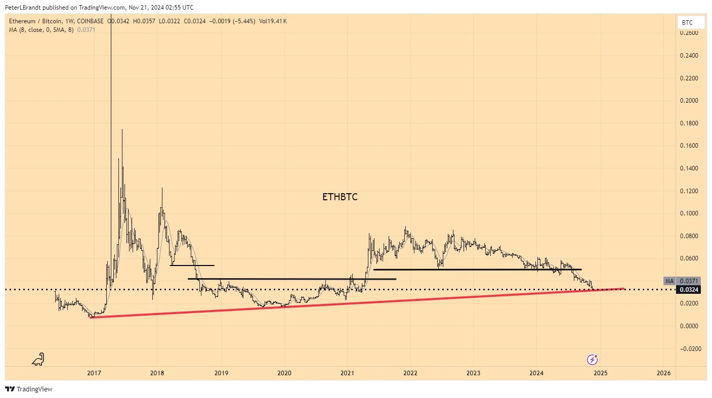传奇大宗商品和外汇交易员 Peter Brandt 11 月 21 日在 X 平台 发文 称“A letter from the grave?”,并配了一张以太坊价格与比特币汇率图。如下图,该图显示了 4 年前当 ETH/BTC 汇率位于低位时 ETH 的上涨情况。