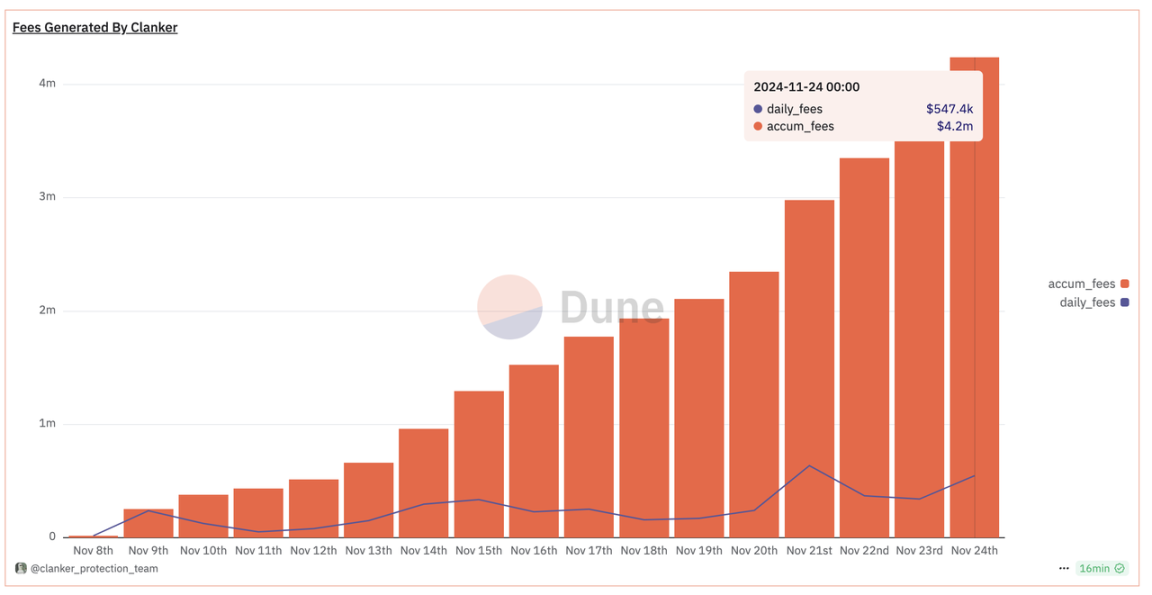 截止 2024 年 11 月 26 日,短短两周时间里,clanker 共发行了 3500 个代币,并产生了 420 万美元的收入。