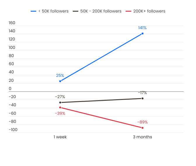 - 而粉丝少于 5 万的小型网红,其推广的 Memecoin 表现更为积极:一周后平均收益 25%,三个月后累积收益高达 141%。