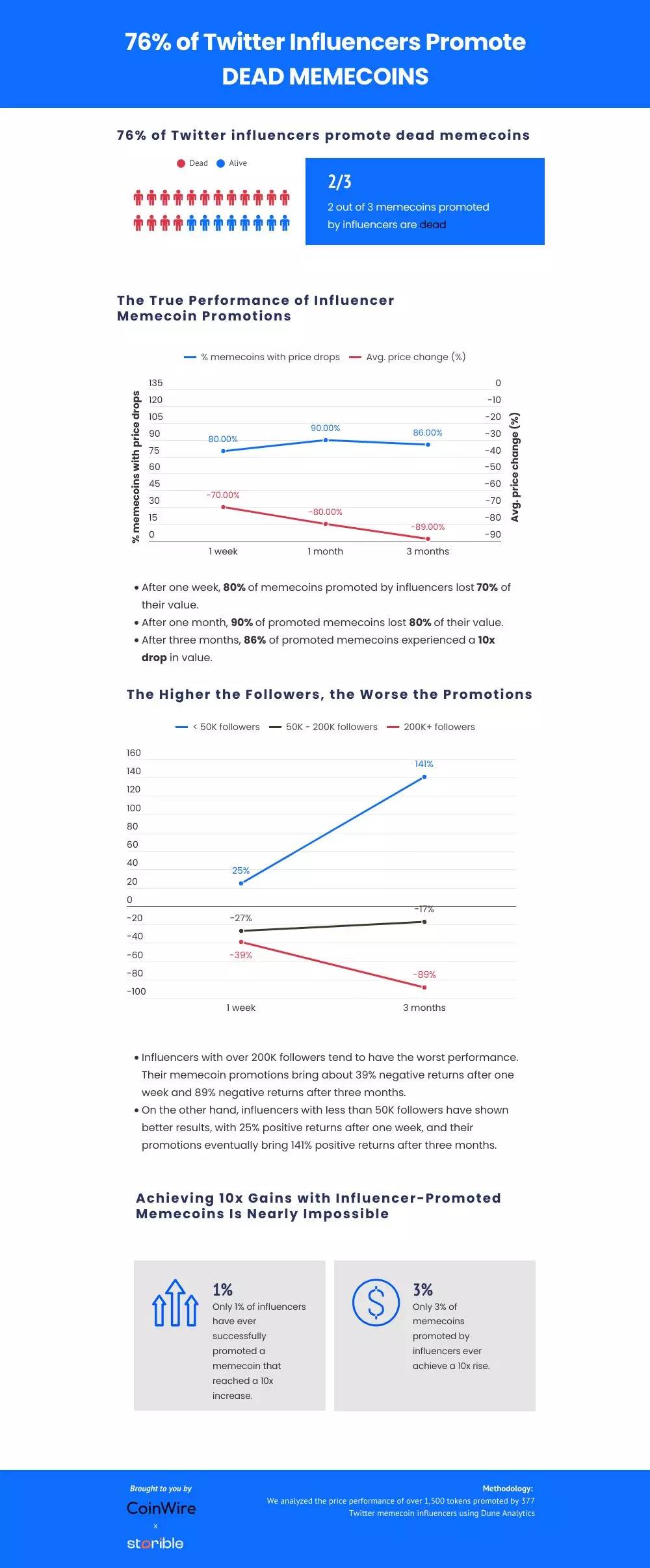 研究发现,76% 的 Twitter 网红曾宣传过现已「死亡」的 Memecoin。实际上,网红推广的 Memecoin 中有 2/3 已经变得一文不值。这表明,大量由网红推动的项目实际上是在为投资者「挖坑」。这些推广经常误导缺乏经验的投资者,使他们在不了解风险的情况下盲目参与。