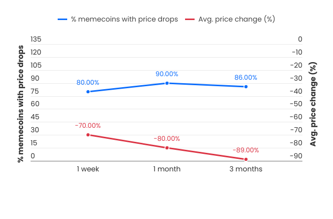 我们将当前价值相比初始推广价格下跌至少 90% 的代币定义为「死亡」Memecoin。