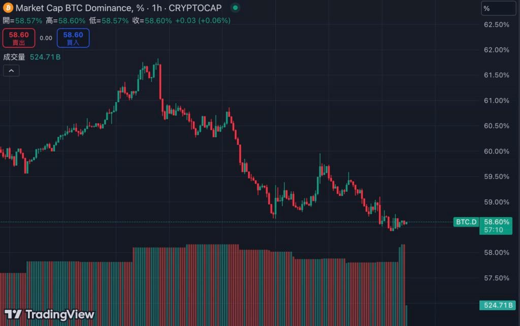 据 Trading View 数据显示,当前比特币在整体加密货币市场中的市占比,已经从上周四逼近 62% 的高点下跌至 58.6%。