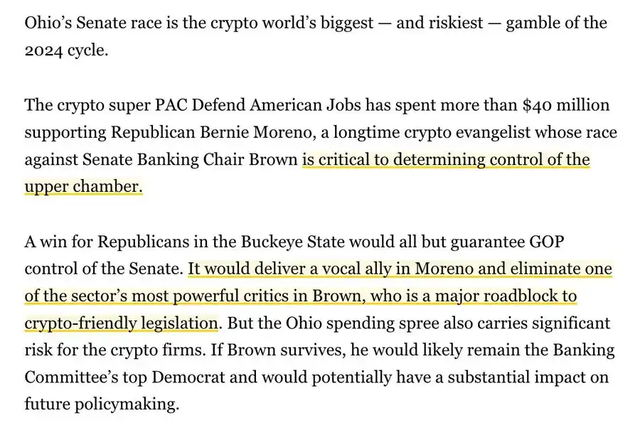 在我选举周的帖子 《Fairshake PAC 的 1.33 亿美元去哪了?》 中提到,伯尼·莫雷诺(共和党)在俄亥俄州参议院选举中获得了 4010 万美元的捐款,以击败舍罗德·布朗(民主党)。