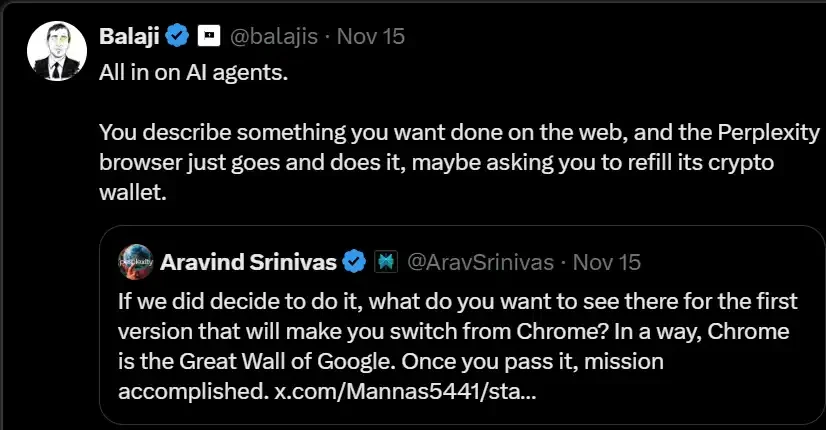 Balaji 转推了 Aravind Srinivas 的请求,内容是开发一种把代理当作一等公民对待的 Perplexity 浏览器。