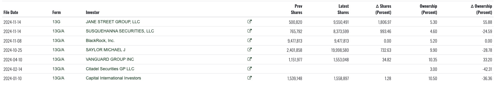 根据当前 MicroStrategy 的持股比例中,不乏一些顶级的财团,例如 Jane Street 和贝莱德等,而作为创始人的 Michael Saylor 仅占 10% 不到,当然通过双层股权的设计,Michael Saylor 拥有的投票权具有绝对优势,因为其持有的股票更多的是 B 类普通股更多,而 B 类普通股的投票权于 A 类是 10:1 的关系。所以这家公司还处在 Michael Saylor 强有力的控制下,但是其股权占比并不高。