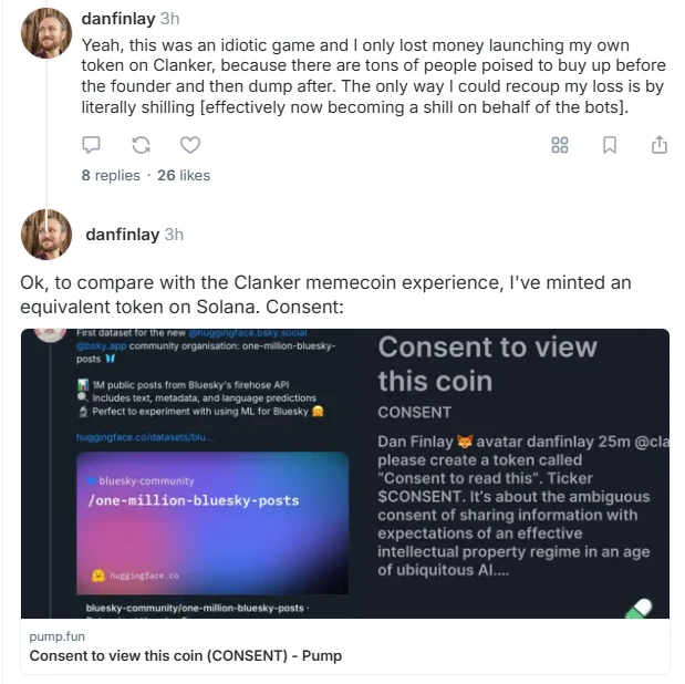 随后 Dan 进一步表示,自己反而因为通过 clanker 部署代币亏损,因为有很多人在创始人之前买入,然后在创始人之后抛售,现在只能通过“喊单吹票(shilling)”的方式弥补损失。