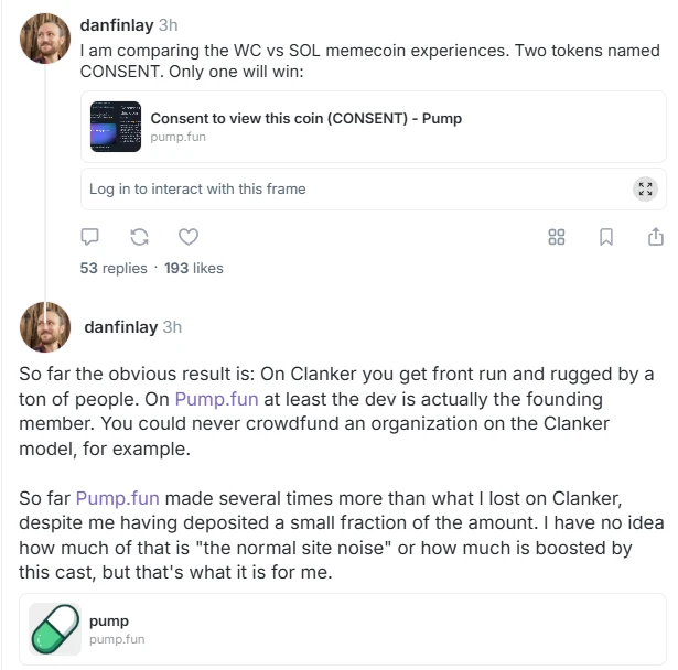 正在比较 WC(Warpcast)和 SOL 的 Meme 币体验。有两个名为 CONSENT 的代币,最终只有一个会胜出。