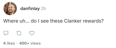 但 dan 似乎并未看到 X 平台的这篇帖子,但他收到了来自其他 Warpcast 用户的提示——“哪里可以看到这些 clanker 奖励(资金)。”